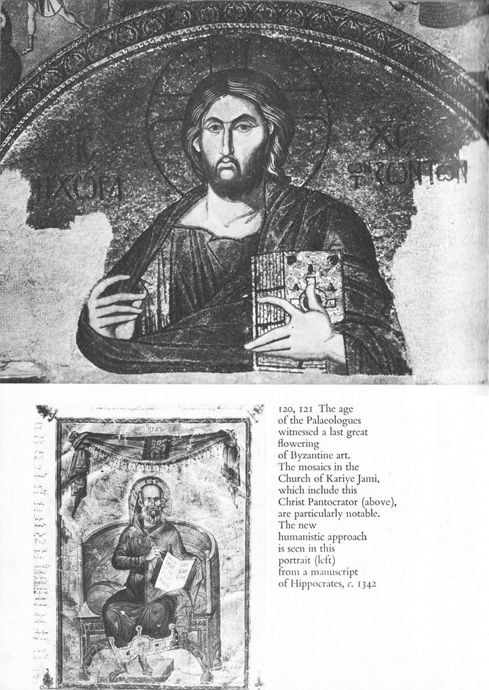 120, 121 The age of the Palaeologues witnessed a last great flowering of Byzantine art. The mosaics in the Church of Kariye Jami, which include this Christ Pantocrator (above), are particularly notable. The new humanistic approach is seen in this portrait (left) from a manuscript of Hippocrates, c. 1342