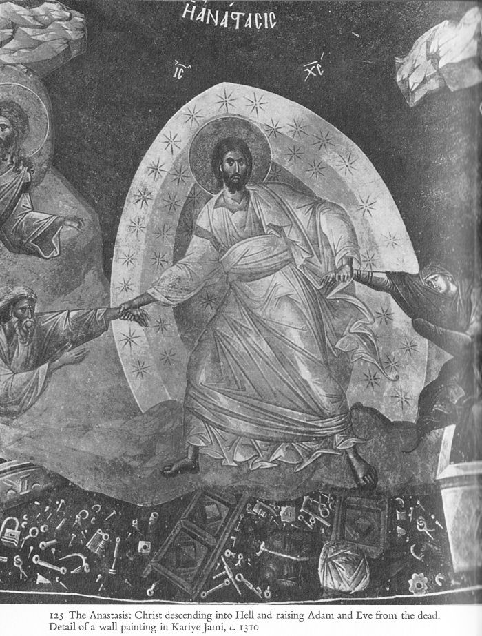 125 The Anastasis: Christ descending into Hell and raising Adam and Eve from the dead. Detail of a wall painting in Kariye Jami, c. 1310