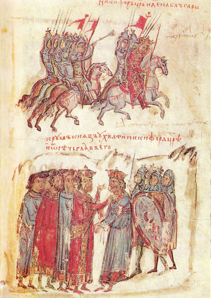 46 The Bulgars’ invasion of Byzantine territory; illustrations in a twelfth-century Slavonic manuscript. In the lower half, Krum, king of the Bulgars, is taunting the captured emperor Nicephorus I