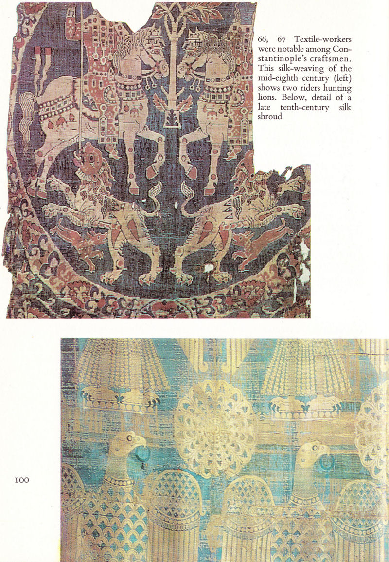 66, 67 Textile-workers were notable among Constantinople’s craftsmen. This silk-weaving of the mid-eighth century (left) shows two riders hunting lions. Below, detail of a late tenth-century silk shroud