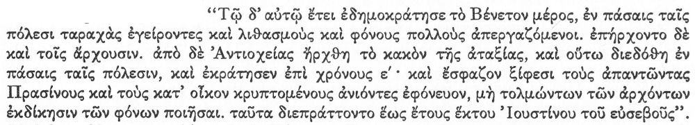 “In this same year the Blue faction created tumults in all cities, raising disturbances and effecting stonings and many murders. And they attacked the authorities. The evil of the disorder began in Antioch and then spread to all the cities, prevailing for five years. With the sword they slaughtered the Greens whom they encountered and going up slew those hiding in their homes, the archons not daring to effect punishment of the murders. These things were done until the sixth year (of the reign) of Justin the pious.“ [15]