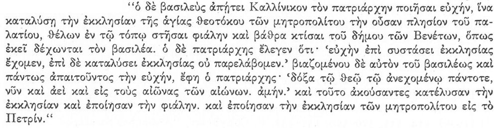 “Ἡ δὲ Τύχη τῆς πόλεως χαλκῆ μετὰ μοδίου ἵσταται ἐν τῇ ἀνατολικῇ ἀψίδι · ἣν ἔφησαν (ὑπὸ) Μιχαὴλ τοῦ Ῥαγγαβὲ χειροκοπηθῆναι αὐτὴν τὴν στήλην διὰ τὸ μὴ ἰσχύειν τὰ δημοτικὰ μέρη κατὰ τῶν ἀνακτόρων”.