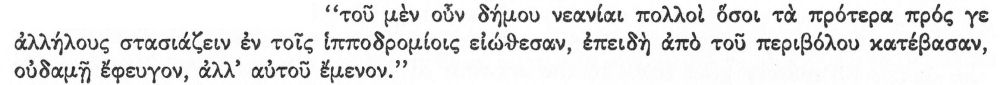 “However, many of the young men of the populace who had on former occasions been in the habit of fighting with one another in civil strife in the hippodromes, though they descended from the wall, in no way fled but remained where they were.” [28]