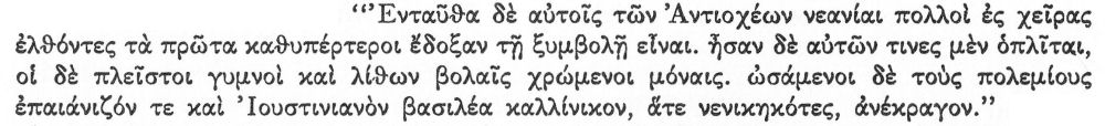 “There many of the young men of the Antiochenes fought with them and in the beginning seemed to be winning the battle. Some of them (the young men) were hoplites (heavily armed), but the majority were unarmed, throwing stones only. Repulsing the enemy, they struck up the paean and proclaimed the emperor Justinian victorious, as if they had won.” [29]