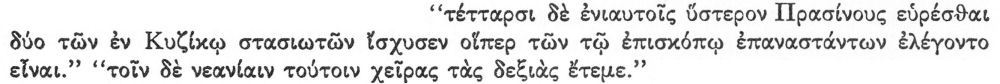 “And in the same month there broke out a battle of the demes in Cyzicus as a result of which many were killed from both factions.” [33]