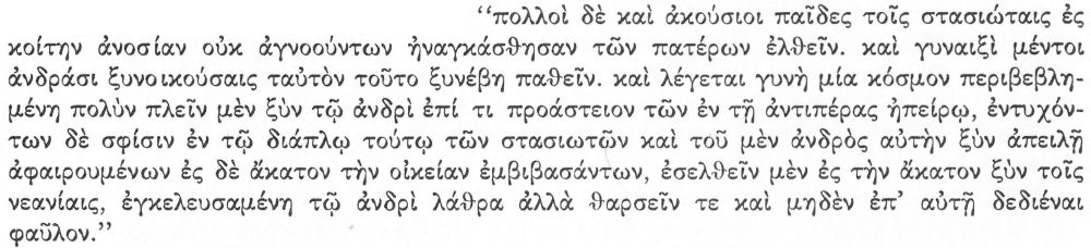 “And many money-lenders were forced through sheer compulsion to restore to their debtors their contracts without having received back any part of their loan, and many persons not at all willingly set their slaves free. And they say that certain women were forced by their own slaves to many acts that were sore against their will. And already the sons of men of high station, having mingled with these young men (νεανίαι), were compelling their fathers to do much against their will and in particular to deliver over their money to them.” [39]