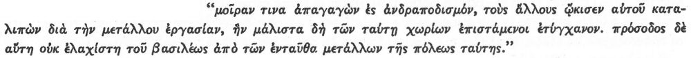 45. Chalcocondyles, ii, 242. “χαλκὸν δέ, ὥς ἄλλοθι μοι τοῦ λόγου, φέρει ἡ χώρα αὔτη μόνη τῶν ἐν τῇ Ἀσίᾳ, χαλκὸν δέ κάλλιστον μετά γε τὸν Ἰβηρίας χαλκόν, ἀφ᾿ ὅὗ δὴ προσήει τῴ βασιλεῖ ἐπέτειος φόρος χρυσίου πέντε μυρίαδες στατήρων.”