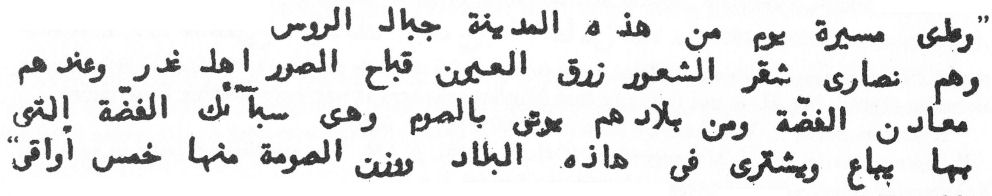 A day’s march from this town are the mountains of the Russians. These are Christians, red-haired and blue eyed, with ugly faces and treacherous. In their country are silver mines and thence are brought the ingots of silver with which selling and buying are done in this land (Crimea). The weight of these ingots is five ounces. [38]