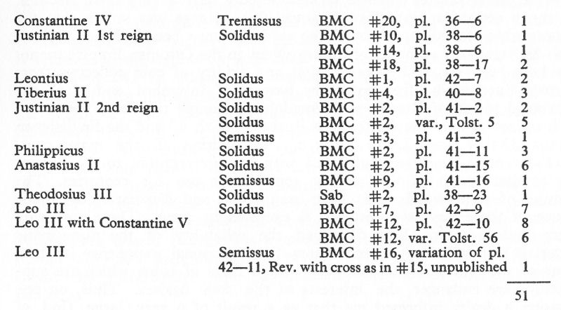 The subject of this article is a hoard of fifty-one gold coins from Attica, the contents of which range from the reign of Constantine IV through that of Leo III. This find, which includes forty-seven solidi, three semissus pieces, and one tremissus, is one of two contained in the Thomas Whittemore Collection of Byzantine coins in the Fogg Museum at Harvard University [1]. The coins are for the most part in mint condition and represent issues of eight emperors and nine reigns.