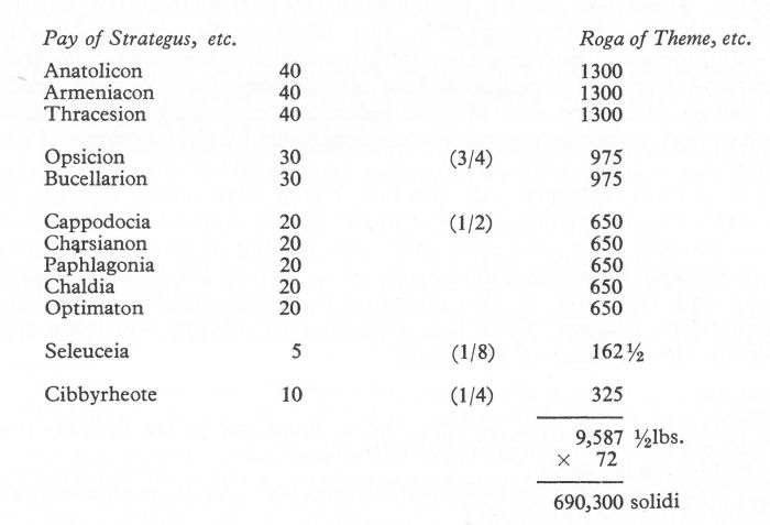A further indication of the role played by a money economy based on gold are the following two factors: (1) The soldiery were paid in gold; (2) A significent portion of the taxes was paid in cash. Again it is due to two chance remarks in Theophanes that the size of the military roga of two themes has been recorded. In the last year of the reign of Nicephorus I, Theophanes reports, the Arabs captured the military pay chest of the theme of Armeniakon. The roga amounted to 1,300 lbs. of gold, or 93,600 solidi [26]. Two years earlier the Bulgars had performed a similar deed by capturing the pay chest of the theme of Strymon, which amounted to 1,100 lbs. of gold, or 79,200 solidi [27]. These two figures are fairly consistent one with the other. The difference between the two sums is to be explained by the fact that the Armeniacon was a larger theme with a larger army and hence a larger sum of cash was needed. It is possible, on the basis of these two figures, to speculate with some profit as to the thematic military budget for Asia Minor in the ninth century. We may use the pay of the various Asia Minor strategoi to fix roughly the proportions of the pay chest of the various themes.