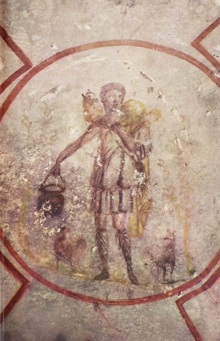 Farbtafel I Rom. Callistus-Katakombe. Fresko. Guter Hirte. Mittelstück aus einer Deckendekoration. Mitte 3. Jh.
