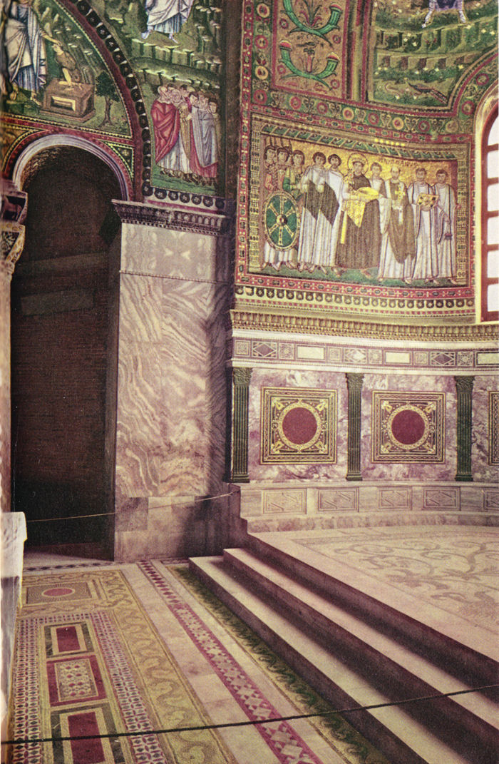 Farbtafel V Ravenna. San Vitale. Presbyterium. Nordostwand mit Mosaiken. Im gerahmten Bildfeld: Kaiser Justinian mit Bischof Maximian und Gefolge. 2. Viertel 6. Jh.