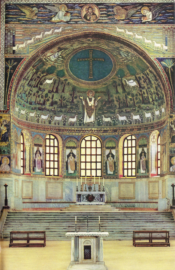 Farbtafel VI Ravenna. Sanf Apollinare in Classe. Apsismosaiken. Obere Kuppelzone: Elias, Moses, Christus als Kreuz und die drei Lämmer. Darunter: hl. Apollinarius mit zwölf Lämmern. Mitte 6. Jh.