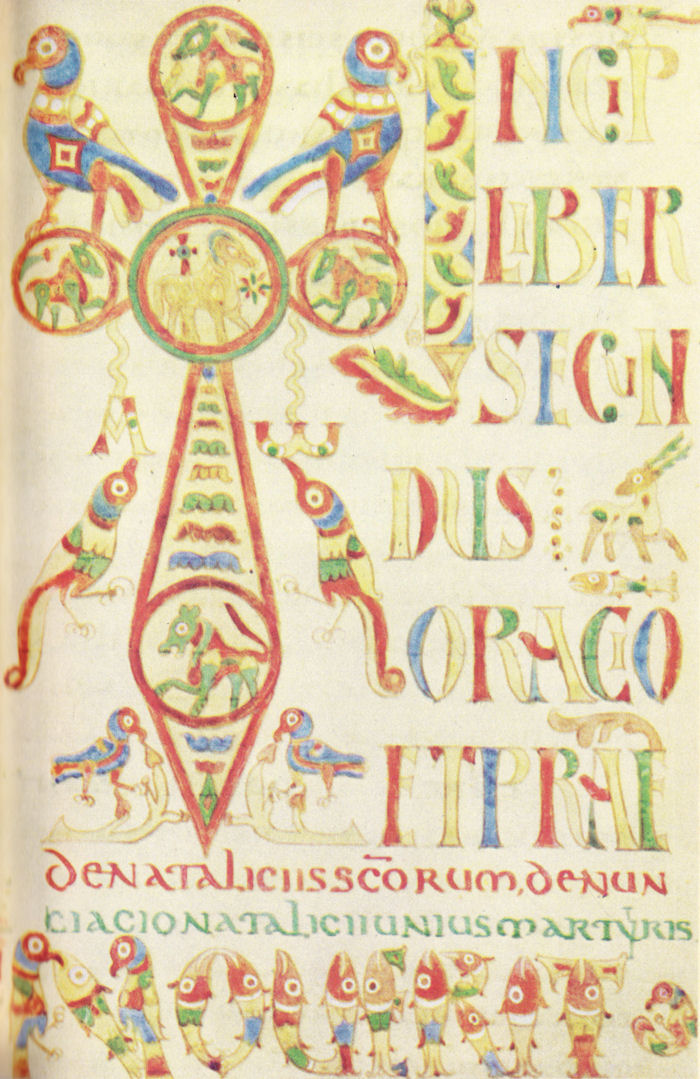 Farbtafel VIII Sacramentarium Gelasianum (Vatikanische Bibliothek, Rom). Initialornamentik. Verbindung von Fisch und Vogelmotiven