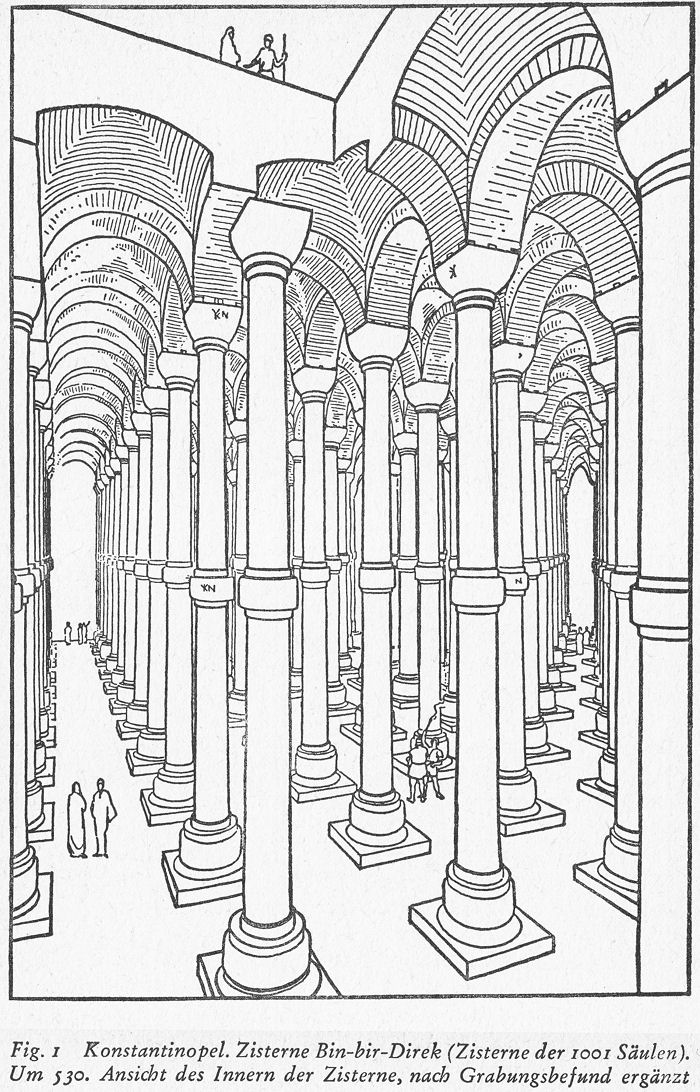 deren konstruktive Lösungen zu den kühnsten Schöpfungen der justinianischen Architektur gehören, so vor allem eine Reihe von Zisternen (die sog. Cisterna Basilika, Yerebatan Saray in der Nähe der Sophienkirche und Bin-bir-Direk, Fig. 1), Thermenanlagen und Aquädukte (der Muallak Kerner bei Konstantinopel wird in der letzten Zeit dem griechischen Architekten des 16. Jh. Sinan zugeschrieben, es ist jedoch anzunehmen, daß er sich an justinianische Vorbilder angeschlossen hat).