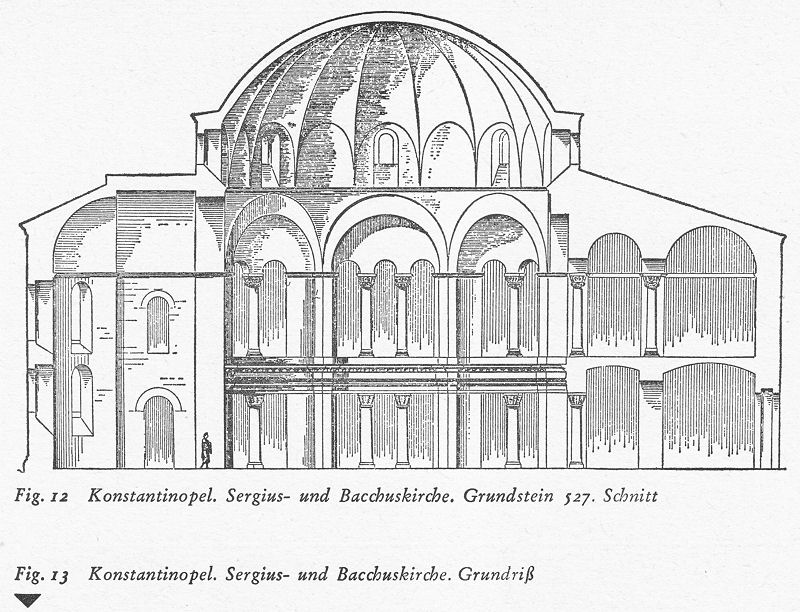 Ähnliche Unterschiede beherrschen die Raumgestaltung. Eine schwere Melonenkuppel, die ihre Vorbilder in den römischen Kuppeln der vorhadrianischen und hadrianischen Zeit (Horti Salustiani, Tivoli Hadriansvilla, Piazza d’Oro, Serapeum) besitzt, lastet in der Sergius-Bacchus-Kirche ohne Tambour über dem Raum. Schwere, massive Pfeiler und breite Nischenwölbungen bilden die Stützen der Kuppel. Die Hauptnische ist verhältnismäßig flach und betont die schwere substantiale Raumwirkung (Fig. 12 und 13).