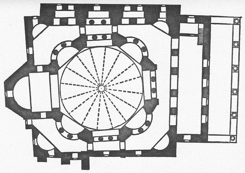 Ein zweites monumentales Beispiel, wo ein Versuch unternommen wurde, einen harmonischen Ausgleich der Raumeinheiten zu erreichen, bildete die Apostelkirche in Konstantinopel (536—546). Die Anlage wurde zerstört und mußte einer Moschee Mohameds II. weichen. Ursprünglich hatten wir es mit einer auf einem gleichförmigen kreuzförmigen Grundriß verteilten Fünfkuppelkirche zu tun. Auch hier ist ein ausgleichendes Raumverhältnis angestrebt worden. Die Tiefenachse ist durch den Altarraum, der sich unter der mittleren Kuppel befand, weitgehendst abgeschwächt worden.