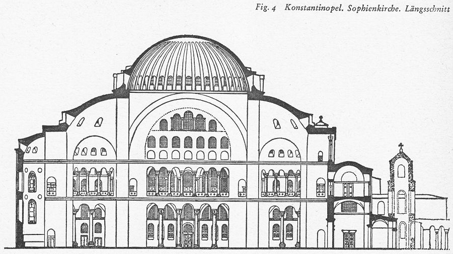 Und nun die östlichen Provinzen des byzantinischen Reiches. Es wäre näherliegend, in der Heimat der beiden Architekten die Vorstufen der Sophienkirche zu suchen. Aber die östlichen Provinzen ruhen auf anderen architektonischen Traditionen. Die griechische und hellenistische Architektur hatte sich Wölbungsproblemen verschlossen. Durch die römische Eroberung dringen zwar Wölbungsprobleme in die östlichen Provinzen ein, aber es besteht im allgemeinen eine Abneigung gegen das Wölben.