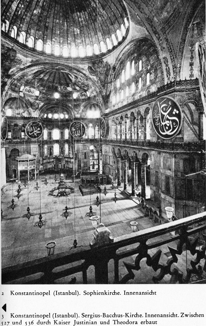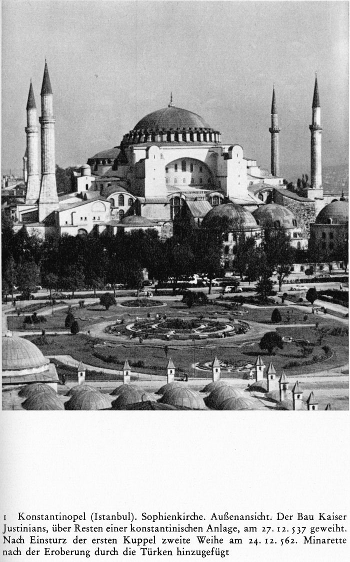 1. Konstantinopel (Istanbul). Sophienkirche. Außenansicht. Der Bau Kaiser Justinians, über Resten einer konstantinischen Anlage, am 27.12. 537 geweiht. Nach Einsturz der ersten Kuppel zweite Weihe am 24. 12. 562. Minarette nach der Eroberung durch die Türken hinzugefügt