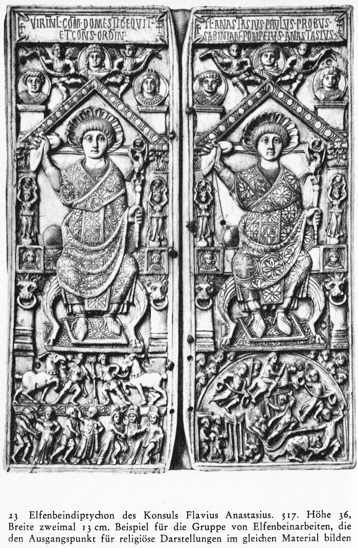23. Elfenbeindiptychon des Konsuls Flavius Anastasius. 517. Höhe 36, Breite zweimal 13 cm. Beispiel für die Gruppe von Elfenbeinarbeiten, die den Ausgangspunkt für religiöse Darstellungen im gleichen Material bilden