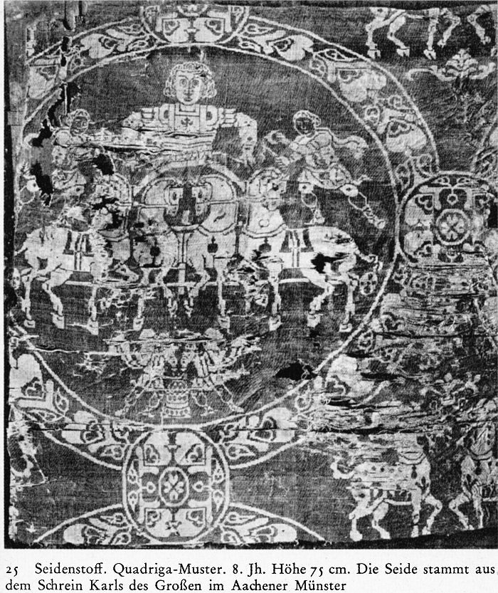 25. Seidenstoff. Quadriga-Muster. 8. Jh. Höhe 75 cm. Die Seide stammt aus dem Schrein Karls des Großen im Aachener Münster
