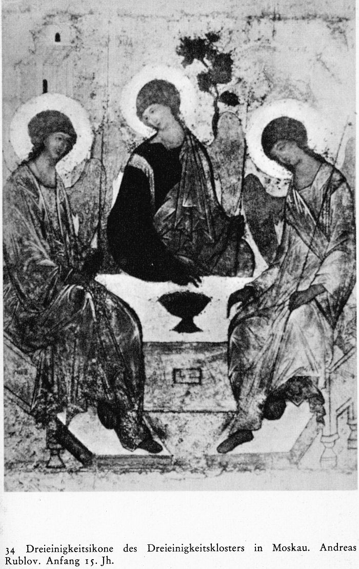 34. Dreieinigkeitsikone des Dreieinigkeitsklosters in Moskau. Andreas Rublov. Anfang 15. Jh.