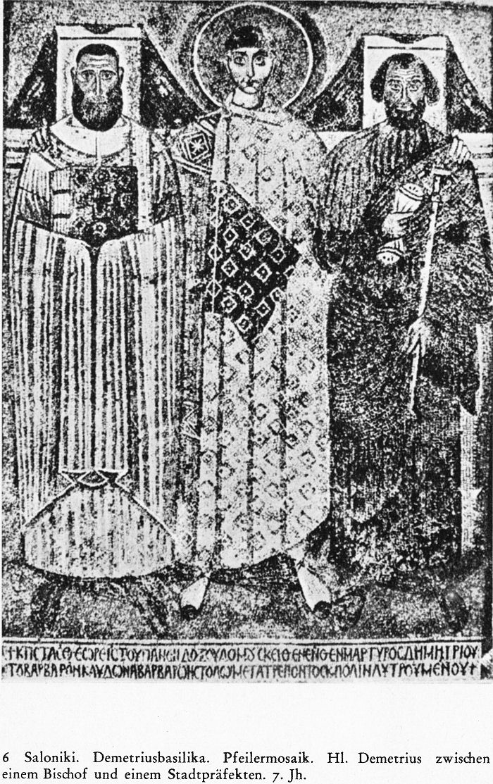 6. Saloniki. Demetriusbasilika. Pfeilermosaik. Hl. Demetrius zwischen einem Bischof und einem Stadtpräfekten. 7. Jh.