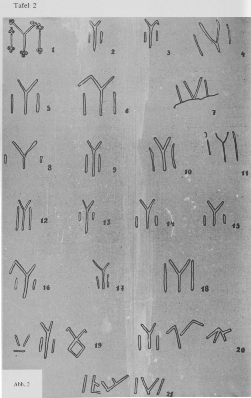 Abb. 2. Protobulgarische Zauberzeichen aus: Prestovac (1), Pliska (2-4, 20), Madara (5-13), Kalugerica (14-16), Preslav (18), Bjala (19), Kărki žaba (21), (Nach N. Mavrodinov, Trésor)