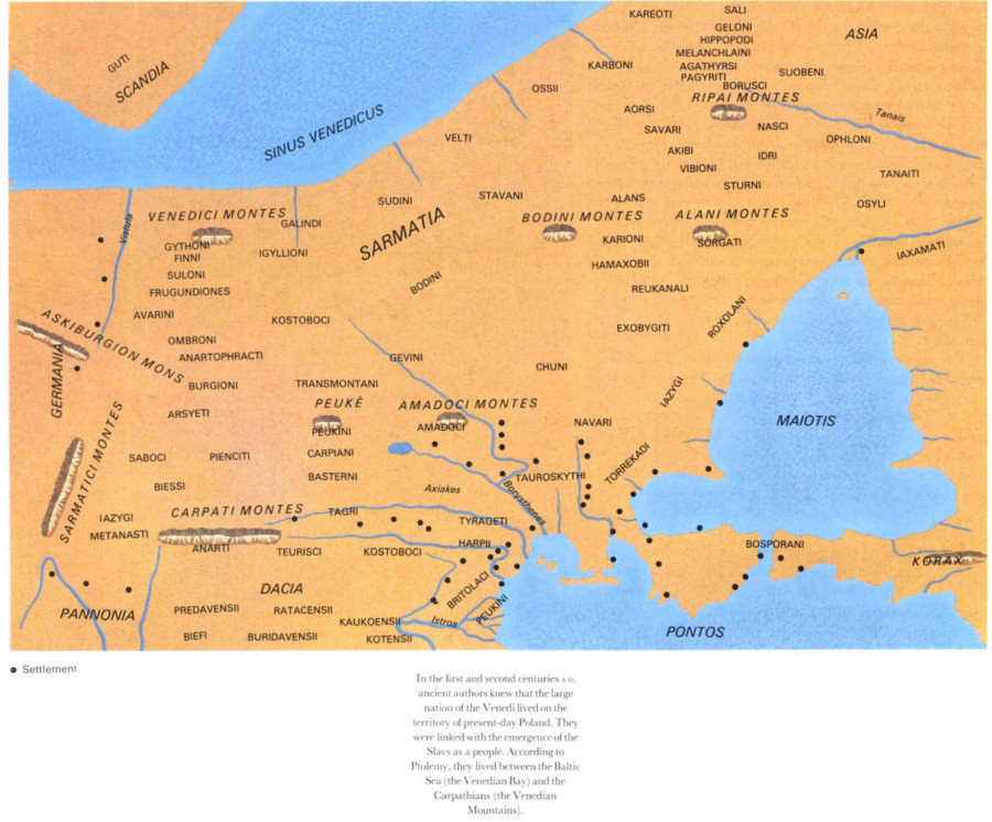 Valuable facts on the Venedi were supplied by Ptolemy, the outstanding mathematician, astronomer and geographer, who lived in Alexandria in the second century A.D. On his map he placed the Venedi to the east of the Vistula towards the Venedian Bay (probably a bay in the Baltic Sea between the mouths of the Vistula and the Memel), and they were spread as far as the Venedian Mountains (clearly the Carpathians). In view of Ptolemy's records scholars looking for settlements of the ancient Slavs have been concentrating largely on the Venedi. For until the sixth century their name was used for the early Slavs, and it has survived to this day in the German name for the Slavs — die Wenden. But it is not entirely clear whether the ancient Venedi can be identified with the Slavs. Their name is not of Slav origin