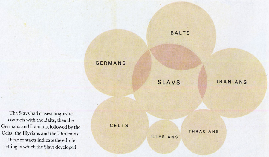 The Slavs had closest linguistic contacts with the Balts, then the Germans and Iranians, followed by the Celts, the Illyrians and the Thracians. These contacts indicate the ethnic setting in which the Slavs developed.