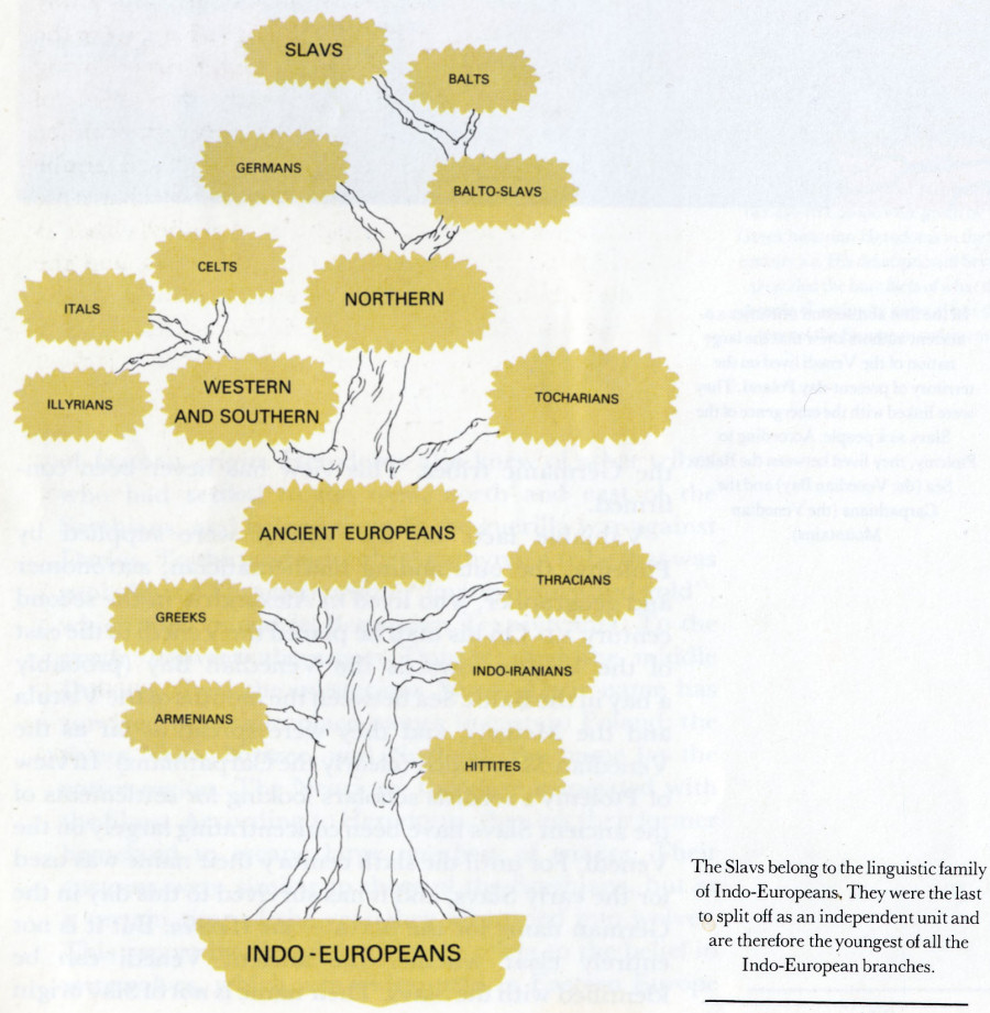 The Slavs belong to the linguistic family of Indo-Europeans, They were the last to split off as an independent unit and are therefore the youngest of all the Indo-European branches.