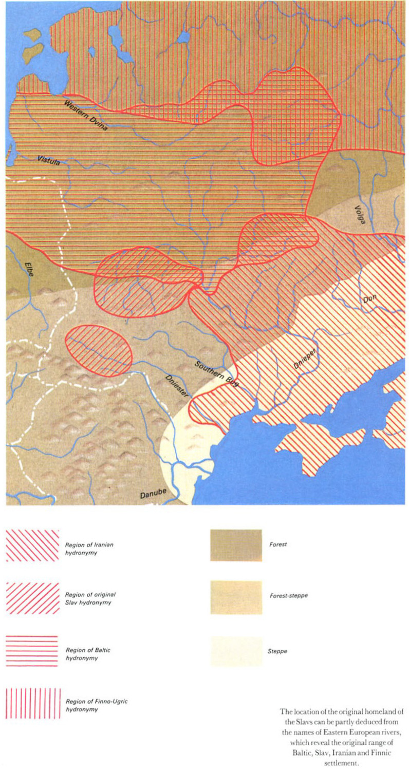 The location of the original homeland of the Slavs can be partly deduced from the names of Eastern European rivers, which reveal the original range of Baltic, Slav, Iranian and Finnic settlement.