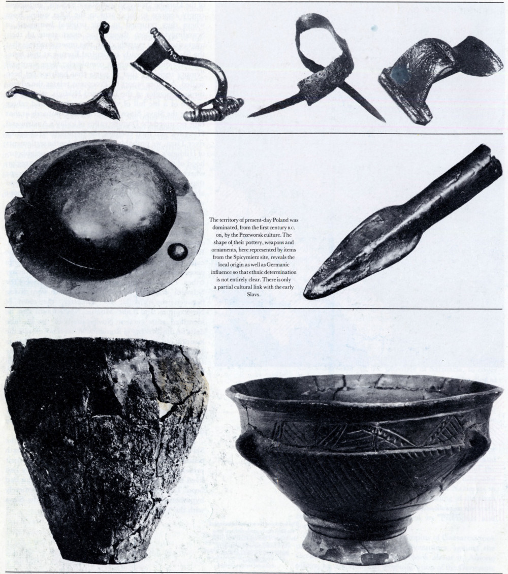 The territory of present-day Poland was dominated, from the first century B.C. on, by the Przeworsk culture. The shape of their pottery, weapons and ornaments, here represented by items from the Spicymierz site, reveals the local origin as well as Germanic influence so that ethnic determination is not entirely clear. There is only a partial cultural link with the early Slavs.