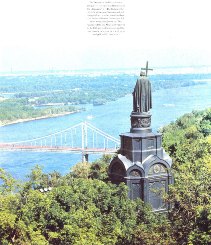 The Dnieper — the Borysthenes of antiquity — was known to Herodotus in the fifth century B.C. The Iranian tribes of the Scythians and Sarmatians lived along its lower reaches in ancient days and the Scandinavian Goths came this far in the second century A.D. The existence of the first Slavs can be proved in the fifth and sixth centuries, and the river became the axis of their settlement and political development.