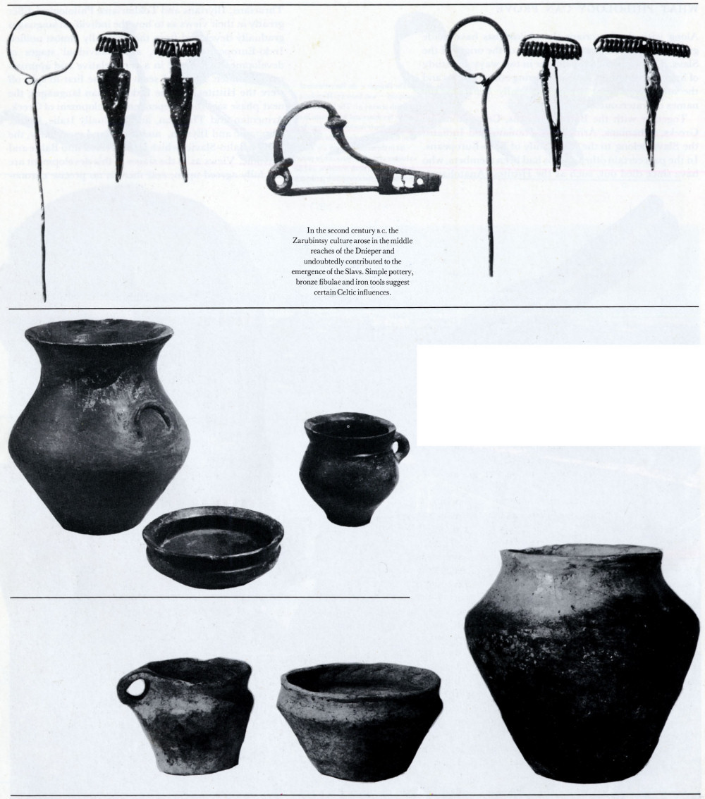 In the second century B.C. the Zarubintsy culture arose in the middle reaches of the Dnieper and undoubtedly contributed to the emergence of the Slavs. Simple pottery, bronze fibulae and iron tools suggest certain Celtic influences.