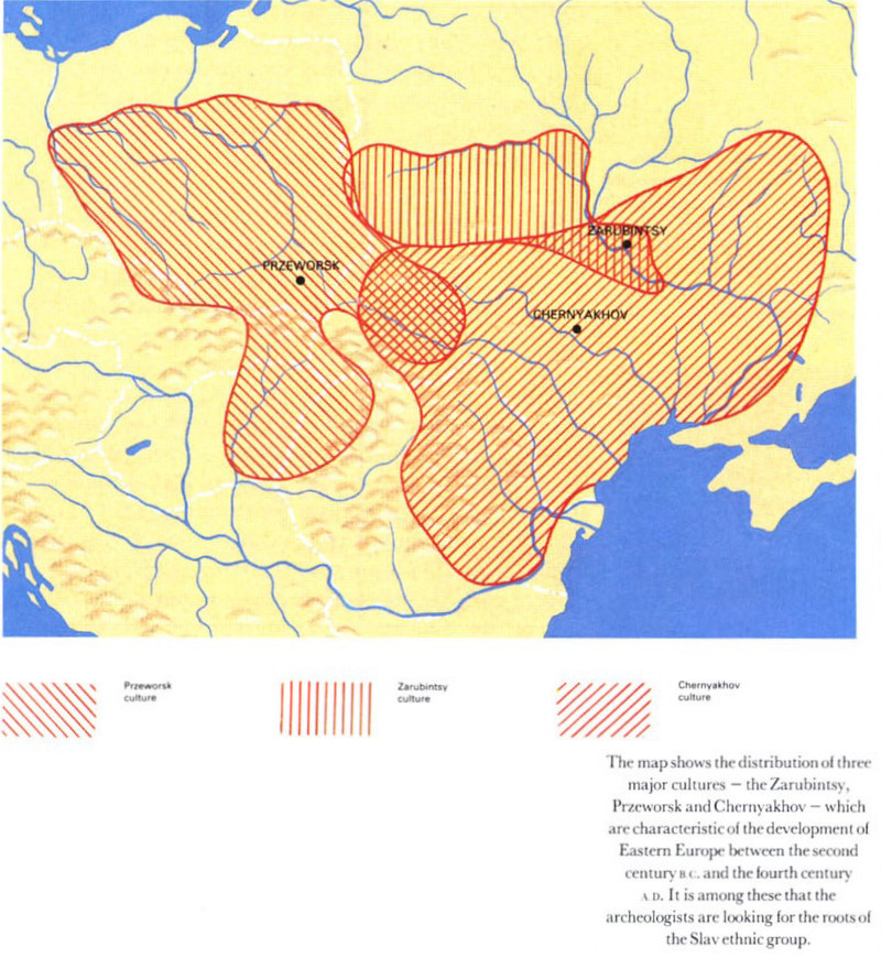 The map shows the distribution of three major cultures — the Zarubintsy, Przeworsk and Chernyakhov — which are characteristic of the development og Eastern Europe between the second century B.C. and the fourth century A.D. It is among these that the archeologists are looking for the roots of the Slav ethnic group.