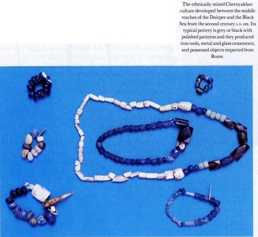 The ethnically mixed Chernyakhov culture developed between the middle reaches of the Dnieper and the Black Sea from the second century A.D. on. Its typical pottery is grey or black with polished patterns and they produced iron tools, metal and glass ornaments, and possessed objects imported from Rome.