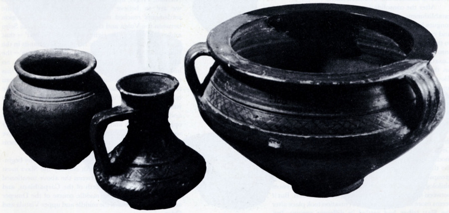 In the second century A.D. a new cultural group emerged on the southern part of the territory where the Zarubintsy culture was dying away and far beyond it — in the broad steppes of the Ukrainian plains right to the shores of the Black Sea. This culture has been subjected to intensive studies and a very lively exchange of views. It is the CHERNYAKHOV CULTURE, called after an extensive burial ground at Chernyakhov near Kiev, which was uncovered and studied in 1900. To date hundreds of settlements have been discovered scattered mostly in narrow strips along the rivers — sometimes to a distance of 800 metres (about 815 yards) — and a large number of burial grounds with mixed burial rites, both cremations and inhumations, the latter predominant. What is typical is gray or black pottery with polished patterns and of good craftsmanship, but beside it also cruder, unpolished artefacts have been found. The production of iron tools and metal ornaments was of high standard. There were even imports from the Roman Empire, which are very important for dating: coins, amphoras, buckles, little lamps and fine pottery known as terra sigillata.