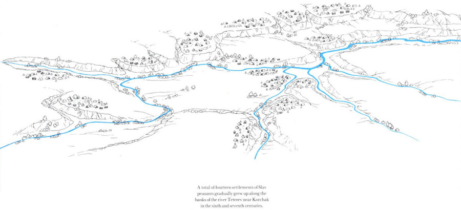 A total of fourteen settlements of Slav peasants gradually grew up along the banks of the river Teterev near Korchak in the sixth and seventh centuries.
