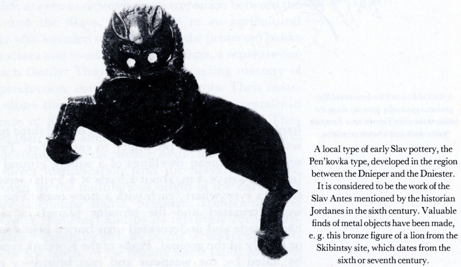 A local type of early Slav pottery, the Pen'kovka type, developed in the region between the Dnieper and the Dniester. It is considered to be the work of the Slav Antes mentioned by the historian Jordanes in the sixth century. Valuable finds of metal objects have been made, e. g. this bronze figure of a lion from the Skibintsy site, which dates from the sixth or seventh century.