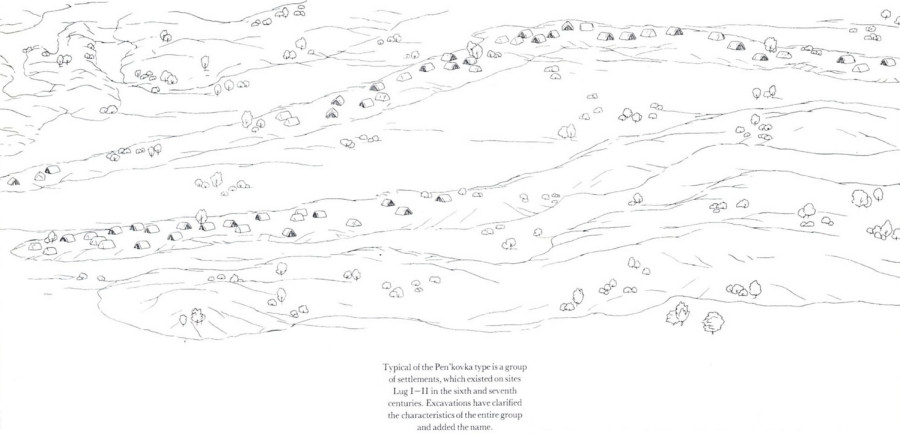 The third region associated with the process of Slav ethnogenesis lay between the lower Dnieper and the Dniester and in the river basin of the Southern Bug. According to a site found in 1955 the archeologists appended the name PEN'KOVKA TYPE to this group. Excavations brought to light five settlements spread over seven kilometres (about four miles) along the banks of the river Tiasmin. In character, choice of terrain and type of dwellings, they were of a similar type as the settlements of the Korchak group. Likewise the handmade, unornamented pottery is close to the Korchak group but differs from it by the predominance of bi-conic shapes that are strongly reminiscent of similar finds in the forest regions of the north. Among the numerous metal objects are valuable fibulae which facilitate dating into the sixth to seventh century. But strong links with the preceding Chernyakhov culture, which vanished at the turn of the fourth to the fifth century, point to an earlier origin of the Pen'kovka type. These two types have even been found side by side. The contacts with the remnants of the Chernyakhov population and the assimilation of their culture must have taken place in the fifth century. Some scholars are, therefore, of the opinion