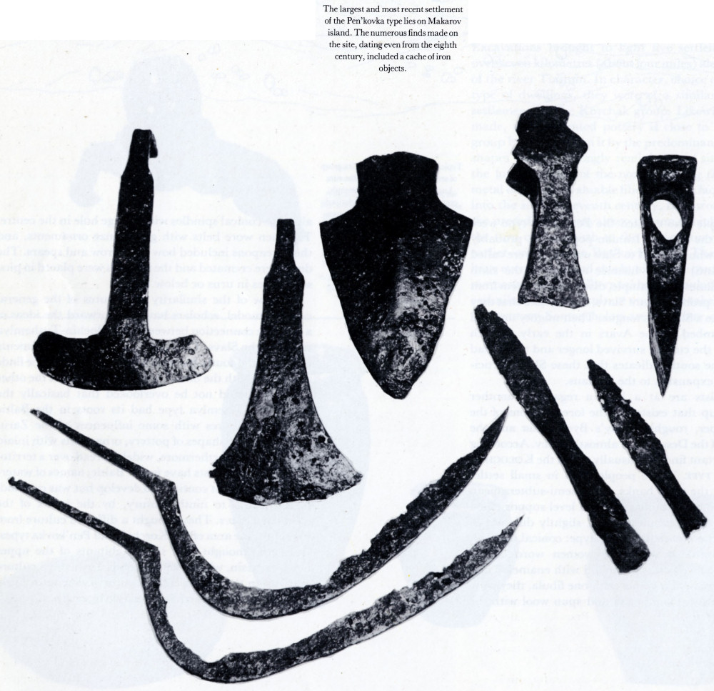 The largest and most recent settlement of the Pen'kovka type lies on Makarov island. The numerous finds made on the site, dating even from the eighth century, included a cache of iron objects.