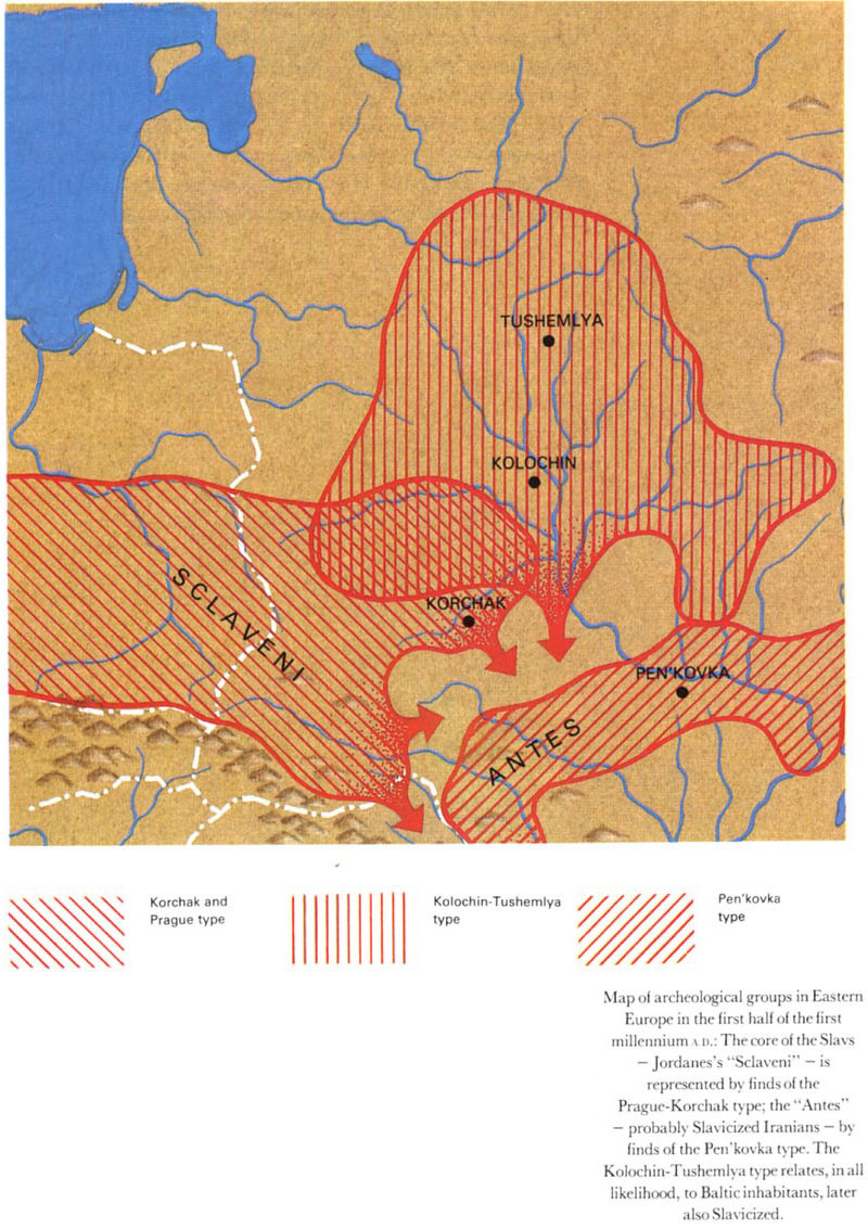 Map of archeological groups in Eastern Europe in the first half of the first millennium A.D.: The core of the Slavs — Jordanes's "Sclaveni" — is represented by finds of the Prague-Korchak type; the "Antes" — probably Slavicized Iranians — by finds of the Pen'kovka type. The Kolochin-Tushemlya type relates, in all likelihood, to Baltic inhabitants, later also Slavicized.