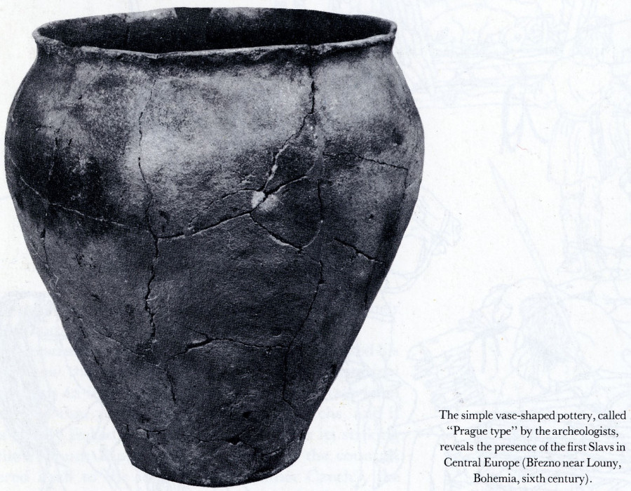 In this manner the archeological finds of the Prague type document the advance of Slav tribes from the east to the west: first they are to be found in eastern Slovakia (perhaps as early as in the first half of the fifth century); then in south-western Slovakia (second half of the fifth century); in southern Moravia (at the turn of the fifth to sixth century); later in Bohemia (first half of the sixth century) and finally between the Elbe and the Saale (second half of that century). What the contemporaries of this historic process — Procopius and Jordanes — did not reveal was shown by mute evidence in the hands of the archeologists.