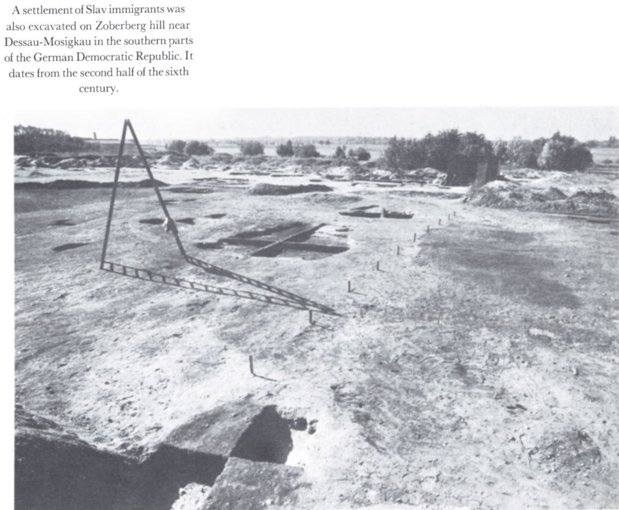 A settlement of Slav immigrants was also excavated on Zoberberg hill near Dessau-Mosigkau in the southern parts of the German Democratic Republic. It dates from the second half of the sixth century.