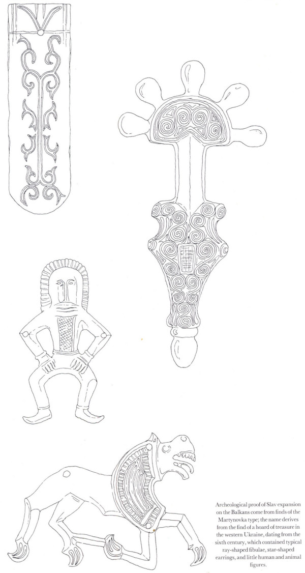 Archeological proof of Slav expansion on the Balkans come from finds of the Martynovka type; the name derives from the find of a hoard of treasure in the western Ukraine, dating from the sixth century, which contained typical ray-shaped fibulae, star-shaped earrings, and little human and animal figures.