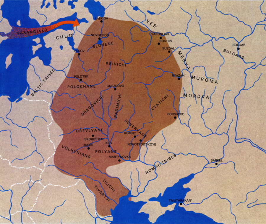 Poloť, an upper tributary of the W. Dvina, lay the dwellings of the Polochane, with Polotsk as their centre. They were related to the Krivichi, who by stages came to occupy a vast territory in the river basins of the Dvina, Dnieper and Volga. The region east of the Dnieper was taken over by the Radimichi and Vyatichi tribes, whose original home had been the territory of present-day Poland. Further to the north were the Slovene who had their homes in the vicinity of Lake Il'men' where Novgorod was an important centre. The western fringe was held by the Dulebi, later Buzhani-Volhynians (this may have been one and the same tribe which merely changed its name). The southern end of the Eastern Slav branch was made up of the Ulichi and Tivertsi, who settled along the rivers Dniester and Prut, where the frontier with Romania runs today.