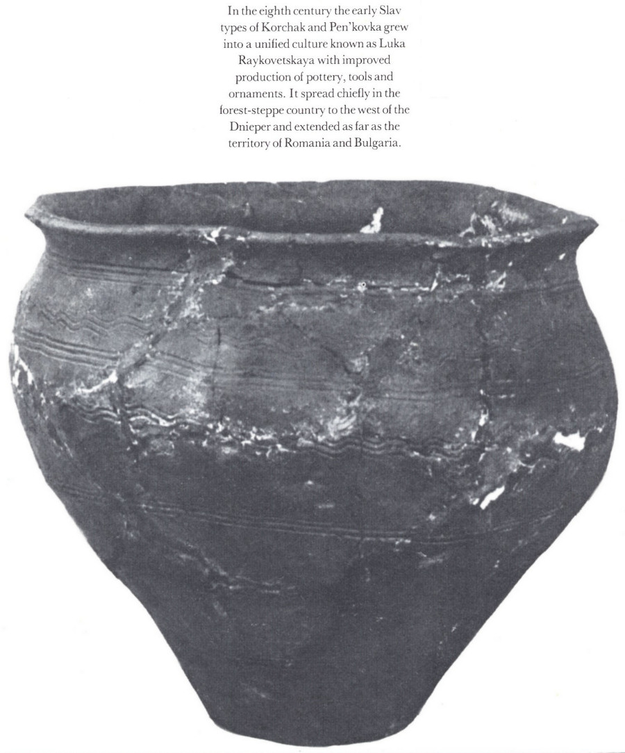 In the eighth century the early Slav types of Korchak and Pen'kovka grew into a unified culture known as Luka Raykovetskaya with improved production of pottery, tools and ornaments. It spread chiefly in the forest-steppe country to the west of the Dnieper and extended as far as the territory of Romania and Bulgaria.
