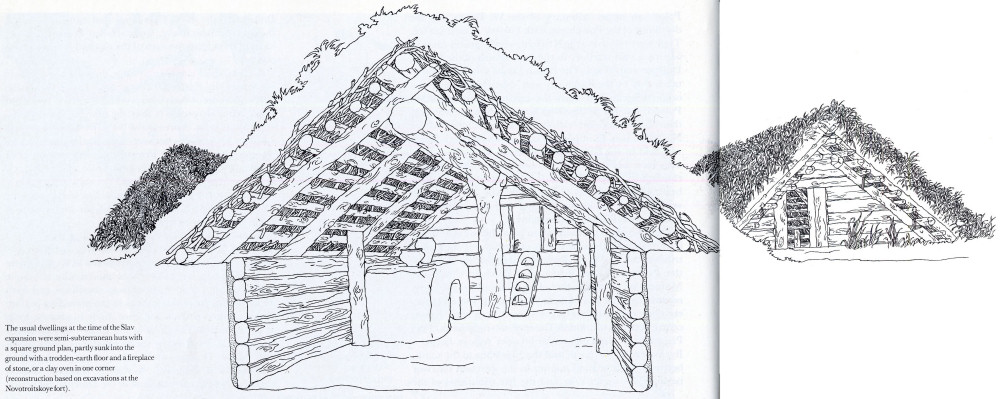 The usual dwellings at the time of the Slav expansion were semi-subterranean huts with a square ground plan, partly sunk into the ground with a trodden-earth floor and a fireplace of stone, or a clay oven in one corner (reconstruction based on excavations at the Novotroitskoye fort).