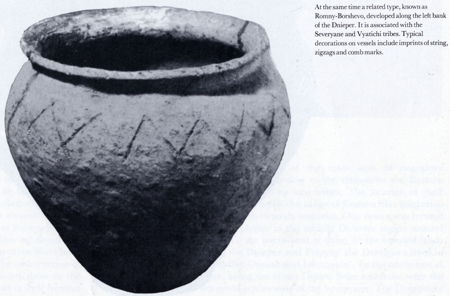 At the same time a related type, known as Romny-Borshevo, developed along the left bank of the Dnieper. It is associated with the Severyane and Vyatichi tribes. Typical decorations on vessels include imprints of string, zigzags and comb marks.